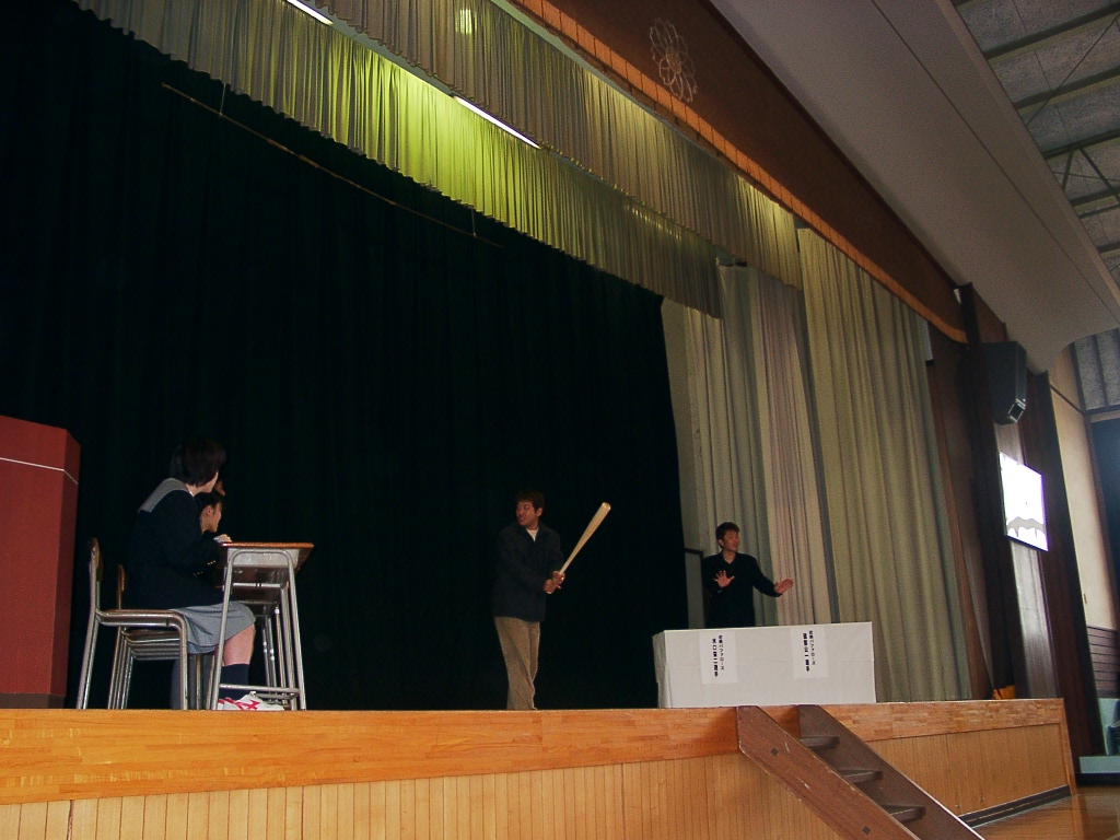 平成14年1月18日(金)、昨シーズン12年ぶり4度目のリーグ優勝を果たした近鉄バッファローズの水口栄二内野手と磯部公一外野手をお招きし、本校にて交流会を実施した。生徒会の進行のもと、「生徒からの質問コーナー」というかたちで会は始まった。「打席につく前の心況は?」、「年俸の使い道は?」、「高校時代の様子は?」など野球やプライベートに関する質問から球界の裏話まで、約1時間に渡り楽しくお話していただきました。最後にはサインして頂いたバットで素振りまで披露して頂き、両選手の人柄溢れる交流会は拍手の中、幕を閉じた。ぜひとも、来季こそは悲願の日本一を手に入れて欲しいものである。