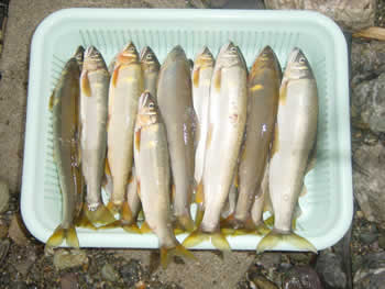友達と2人で 朝から鎌井田のトロ場に釣行 おとりを入れてすぐに 1匹が掛かり、その後 4匹続けて掛かるが後が続かない。友達はぽつぽつ掛かり 昼までに11匹 私は 6匹 昼から 場所を 三石の瀬に移動。
