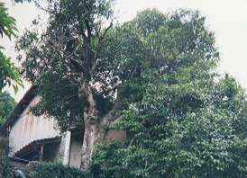 に入って少し行った民家の邸内にあり、樹齢は300年ともいわれる古木。八幡浜市街から港まで一望にする見晴らしの良