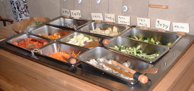 ![]() 旬の野菜のサラダバー550円 3種類の手作りドレッシング ・イタリアン ・和風 ・りんごと玉ねぎ をかけていただきます。 |