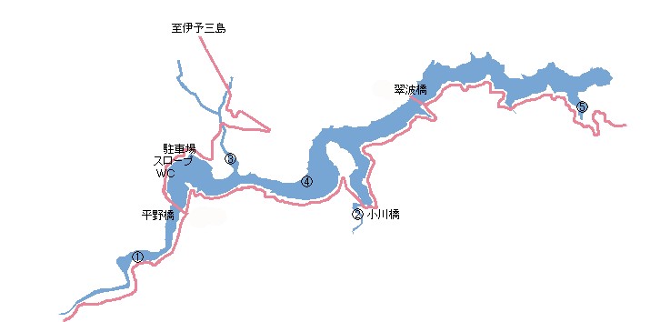 ポイント@.平野橋上流:満水時には上流流れ込み、上流四本柱などがBESTポイント