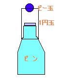 | 1円玉を通り抜けるビー玉 | ![]() | 質量の違いにより、エネルギーに違いが出るため、次のようなマジックができる。図のようにビンの口に1円玉を置く。そして、紙で作った筒をかぶせる。最後にビー玉を上から落とす。すると、1円玉がはじかれて、ビー玉がビンの中に入る。筒をはずすと、一円玉はビンの口の上に置かれた状態になっている。 (TBSニュースステーション1999.12.5より) | |