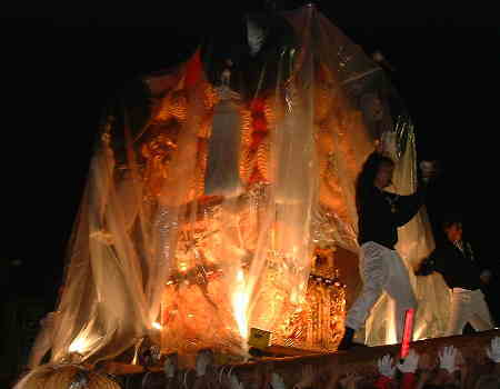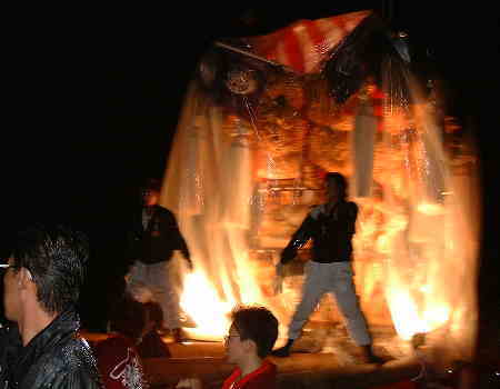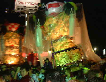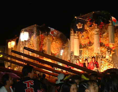 17日午後、山根グランドのかきくらべの興奮も冷めやらぬまま、角野・泉川地区7台が集結し、夜太鼓開始・・・と思いきや遂に心配された雨が・・・。しかし、そのまま続行♪雨の中でのかきくらべが披露されました。