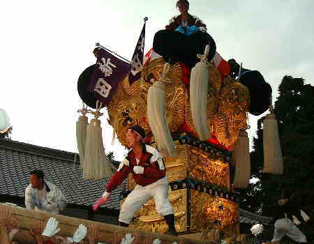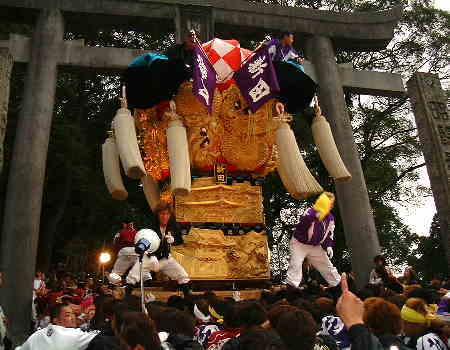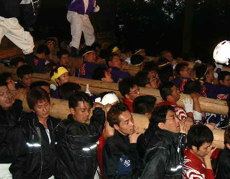 18日夕、いよいよ最後を締めくくる宮入りです。毎年角野地区の太鼓台のうち1台だけ(今年は新田太鼓台)がお神輿のお供で境内に上がります。さすがこのときまで残っているかき夫のみなさん、気合がはいってます!疲れた体でも一気に石段を担ぎ上げてしまいます。