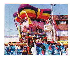 平3枚の布団屋根を持つ「四つ太鼓」。布団屋根は三色にわかれ、全体的にきゃしゃながらバランスのとれたスタイルになっている。この他牛鬼が多数登場するにぎやかな祭り。 |