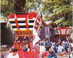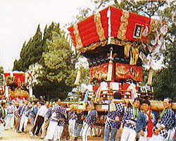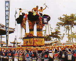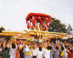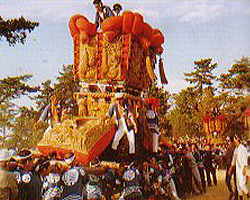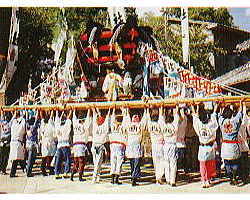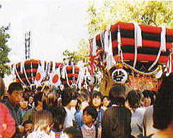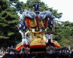 小豆島最大の秋祭りの呼び声高く、15台ほどの太鼓台が運行する。小豆島全体の傾向として、豪華さの追求は「縫い」ではなく彫刻に求めたようで、狭間だけではなく最下部の泥台に至るまで見事な「彫り」を残している。横に倒した太鼓台を一気に反転させる「返し」などの妙技はこの地ならでは。 |