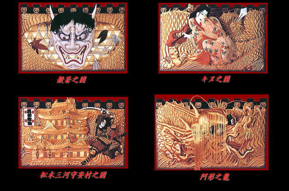 | 特筆点はキヌの晴れ着刺繍と安村公の鎧刺繍が絶品です。また、般若を飾り幕に模している祭事山車は、当太鼓台 |