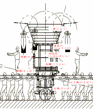 太鼓台の内部構造は概ね下図の通りです。台場の内側に大太鼓が据えられています。