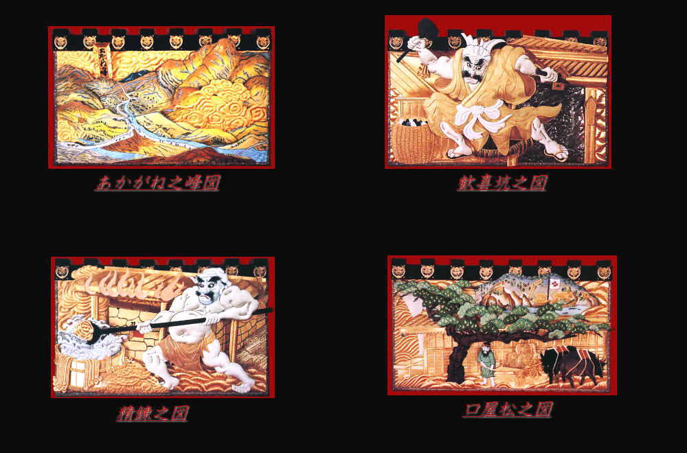 | 上幕の図は、新居浜市の起源とも云える別子銅山にまつわるものとなっています。 銅山峰(あかがね之峰之図)、 |