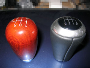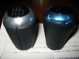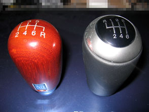 左が純正ノブ。右がOPノブ。 シフトパターンが斜めになってるので純正の方が 見やすいですね。 あと、純正の方が楕円形状です。 でも、判る人にしか判らない程度の差しかないですね。 |