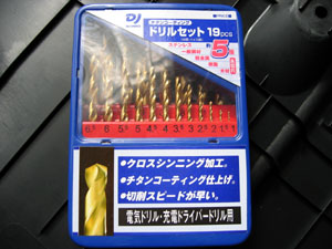 | メジャーと赤マジックでマーキング。すでに3mmの穴 | 手持ちドリルセット | 10mm1本より安かったチタンコートドリル19本セット |