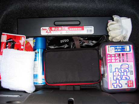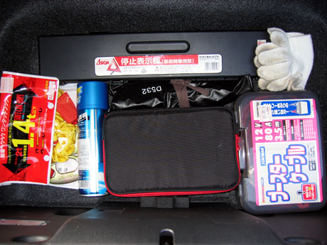 | 上から時計回りに、 ホームセンターで安売りしていた収納ケース付三角停止表示板 軍手、オートバックスで買った収納ケース入ブースターケーブル、 車載パンク修理キット、ガラスクリーナー、牽引ロープ、車載工具 |