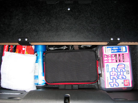 実はだいぶ前に、パンク修理キット含めて、基本装備品全てがフロアマット下のスペースに仕切り無しで綺麗に納めることが出来ました。
