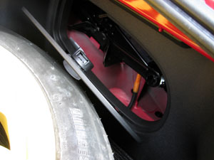 トランク前側。 絶妙にスペアタイヤを避けています。 かといってたっぷり隙間があるわけではありません。 |