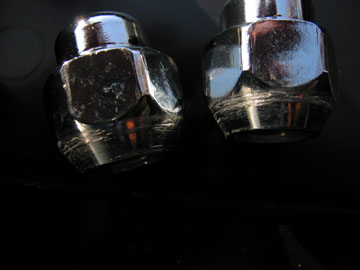 ちなみに7回ほど脱着を繰り返したクリップナット。 3つのホイールを締め付けたためか、接触痕が2条になってます。 NBもこんな感じだった記憶が。 実質締め付け時は線で荷重を受けているんでしょうねぇ。 なお、メーカー装着時?とディーラーでの1ヶ月点検時?以外は 手締めなので、インパクトレンチは使ってません。 |