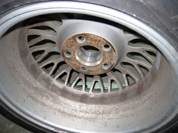 | 日産純正OPBBSの裏側。 ブレーキダストや汚れがこびりついています。 こうなると、ちょっとやそっとじゃ落ちません。 |