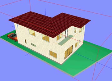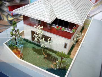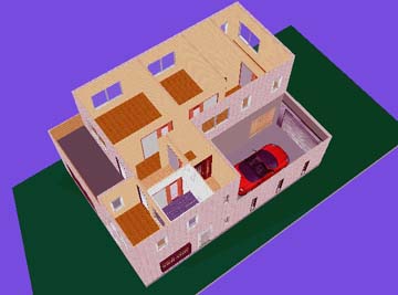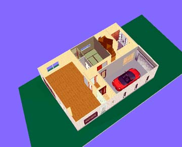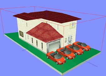 | 立体図 表側、車がMR-Sなのは同サイズの車が無かったから ガレージの屋根は平屋根でいいんだけど |