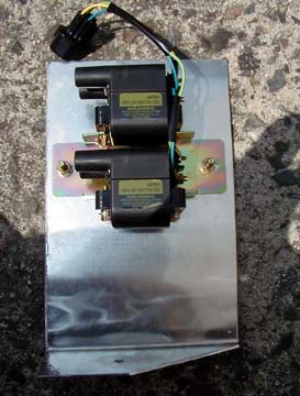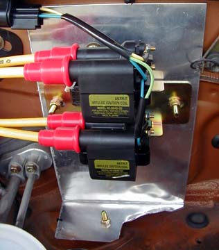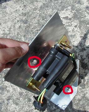 これが、アルミ板で作成したコイル取り付け用ブラケット。赤丸の2箇所で既存のボルト穴を利用してボディーに固定します。