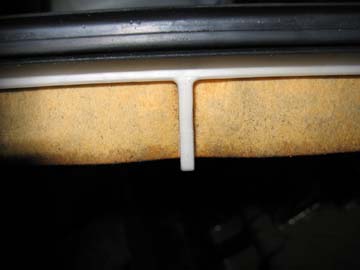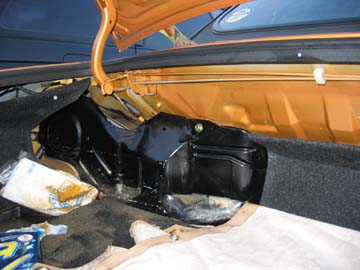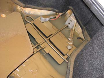 バッテリースペース。 下側のキャップは、受け皿が邪魔で突けませんでした。 少し雑巾で水面を下げて、バッテリーケーブル外して 取り出しました。 密閉式とはいえ、少し希硫酸が漏れ出していたようで、 塗装が一部剥げてました。 |