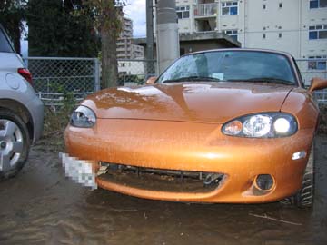 | ちょうどヘッドライト下辺りに泥の跡が付いてます。 少なくとも、濁流がここら辺で長い間あったと言うことですね。 目撃者によると、ボンネットは水没してたらしいです。 |