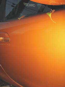 ドア側。ドアハンドル下に泥の跡があります。 窓下端にイチョウの葉っぱが付いていますが、 ここまで水が来たのか、横の木から落ちたのが 付いているのかは判りません。 |