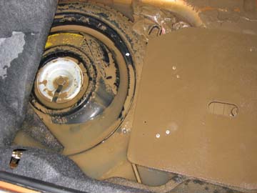 スペアタイヤスペース。 溜まってます。 トランクルーム下裏側にキャップがあるので、それを下から突けば 水は抜けます。(雨漏りで溜まった時にもこれで抜けます) |