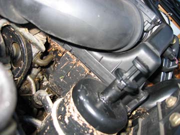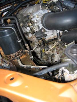 | ボンネットを開けると。。 当然オルタネーターは水没し、ゴミも付着しています。 プーリーも溝に泥が詰まってました。 一応スロットルボディーはぎりぎりセーフなようですが。。 |