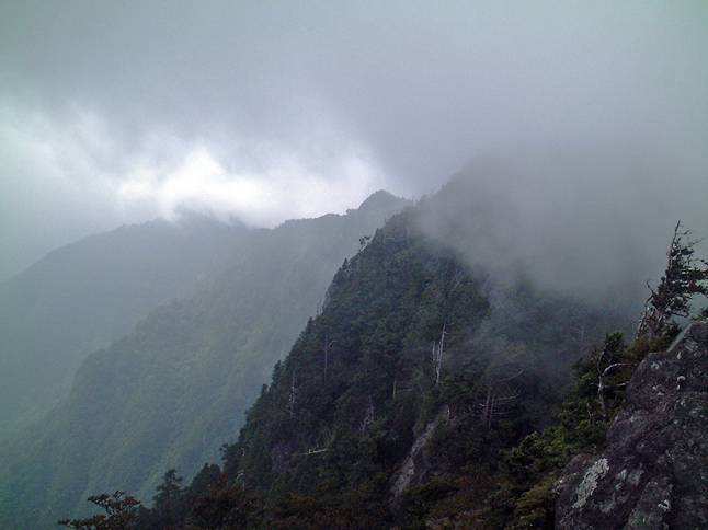 霧の中に浮かぶ 鋭く尖った大岩、直ぐ横を巻いて行きます