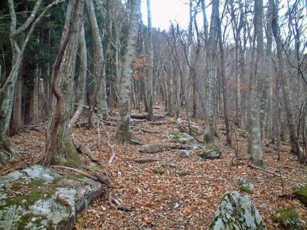 三嶺頂上から避難小屋〜マユミの木〜 ダケモミの丘〜平尾谷登山口