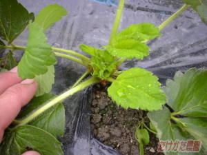 | イチゴを定植して約1ヶ月が過ぎました。地温を上げ株の生育を旺盛にする為に、黒マルチを掛けます。葉を痛め無いように細心の注意を払いながら、小さい穴から葉を出します。 |