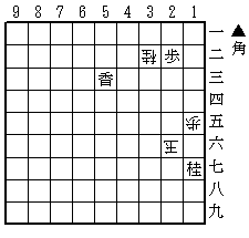 自力正解者・・・10名 【詰手順】 4四角 同桂/2一桂 2一歩生/2七歩 1六玉 2八桂 迄 【解説(のようなもの)】 初級向けの作品を自分のPCの隅を探していて出てきた作品。自分で創ったのにしばらく作意がわからなかった(ボケがすでに出始めた・・・)ので登場させて見ました。何だか創ったような手順で初級あたりが妥当でしょう。角打の紛れを入れるために53香を59くらいに出来ればいうこと無いんでしょうが・・・余詰たらたらじゃあね。 遠い所での駒交換入門編です。 * 橋本孝治 「これは正に初級の部らしい作だと思います。多分、これ以上凝ると短編の部に出さないといけなくなりますね。」 凝ろうとすると余詰防止駒が湧いて出てきて醜くなるのがお約束です 若林 「22歩があるので簡単ではあるけれど、生を含むアンチキルケが入れば充分でしょう。」 隅の老人B 「21歩生が王手とはね。アンチキルケ、万歳!。」 この感覚が身に付けばアンチキルケストです 伊達 悠 「なぜか解くのに10分くらいかかりました。波長が合わなかったのかなー?今でも疑問。」 創った人も解くのに時間がかかったので同じ感覚ですね。磁石の同極同士かも 吉川慎耶 「歩生は定跡。(←調子乗りすぎ)」 ばか系の常識ではあります。(普通すぎ) 小五郎 「大駒を捨てて小駒で詰める、もはや常識?」 この格言は頂きましょう 小峰耕希 「誰かさんのとは違って、初手の限定打でちゃんと作品になっている。初級の部出題作としては上出来でしょう。」 53香無しなら短編行きだったかも・・・ 北村太路 「なかなかトリッキーで面白かったです。桂を無理やり呼んできて不成で取るのが面白い。」 結局取った32桂で詰ますのは面白いかな もず 「遠くでの駒交換。ここに出てくるということは、すでに基本手筋ということですね。」 そろそろですかね 初級の部 総評&解答成績