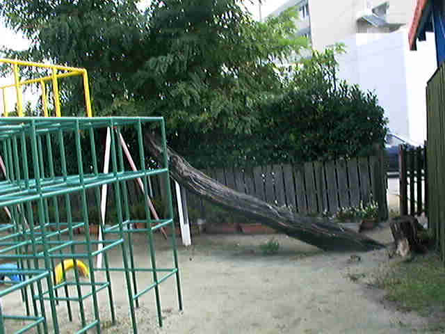 写真は泉幼稚園のジャングルジムの脇にある、斜めに生えた木。 泉幼稚園を昔卒園したという人からのメールで、この木に登って何度も落ちたことがあるとのメッセージをもらった。 卒園生にとっては思い出の木であるようだ。