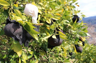 | 明日から、今季最強の寒波襲来が予報されていて、積雪があるかもしれないと思い、みかん山に出かけ、残っている少しのカンペイを収穫しました。これで、私たちの収穫作業はすべて終了しましたが、まだ収穫していない晩かん類を作っているところがあり、雪害がないことを祈ります。 ![]() サンテ袋をかけたカンペイ |