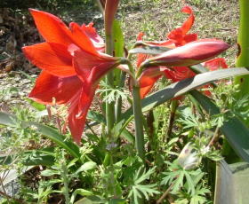 みかん畑の隅に、40年程前から毎年アマリリスが豪華に咲きます。昔々球根を植えたものが、みかんの肥料を吸収して咲くのでしょう。
