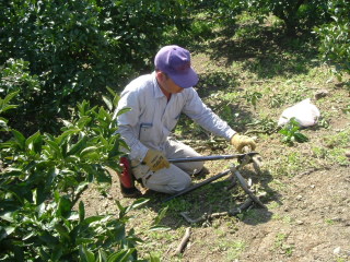 大きな枝は巨大ハサミで切ってやります。小さくなった葉や枝は畑にばら撒きます。そのうちまた土に返ります。