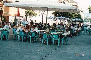 | 湖畔沿いの通りにはカフェテラスが沢山ありますので、人々はのんびりとバカンスを楽しんでいました。 |