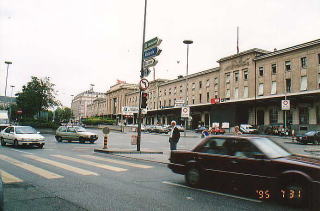 | ここがジュネーヴの駅構内です。美しい地元の花が我々を迎えてくれました。右写真はジュネーヴ駅の建物です。駅前は静かな雰囲気に包まれていました。 |