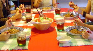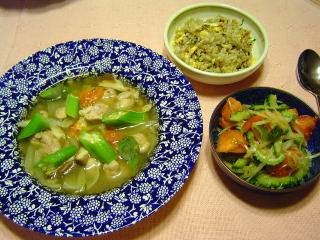 チキンと野菜の実沢山のスープ 材料: チキン、玉葱、トマト、椎茸、おくら、ローズマリー、コンソメ 作り方: @まず、鶏の皮とローリエでスープをとります。 A全ての野菜を一口大に切り、鶏肉には塩胡椒、酒、片栗粉をふり もみ込んでおく。 B野菜を一気にスープの中に入れアクを取りながら少し煮る。 C鶏肉をくっつかないように一個ずつスープの中に落としていく。アクを取る。 Dローズマリーを入れ塩胡椒で味を整える。 E茹でたオクラを彩りに散らす。 ゴーヤとトマトの生姜醤油 材料: ゴーヤ、トマト、玉葱、生姜、薄口醤油 作り方: ゴーヤは塩もみ後さっと茹でて冷水にとり、さらし玉葱、トマトと生姜醤油で和える。 |