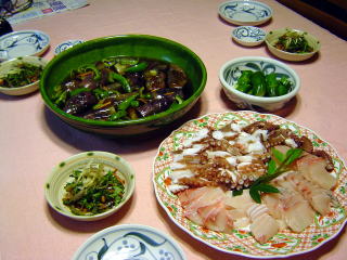カンパチと蛸の刺身 茄子の煮浸し ニガウリとこんにゃくの納豆炒め |