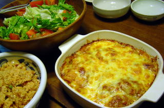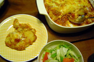 | ポテトとミートソースとチーズの重ね焼き チキンライス グリーンサラダ |