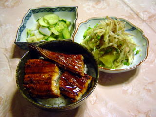 土用の丑の日はそれをメインに、後は副菜を二種。イカとキュウリと紫蘇の酢の物と焼き茄子を作りました。