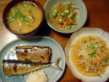 秋刀魚の塩焼き もやしの酢の物、きんぴらゴボウ みそ汁 |