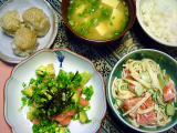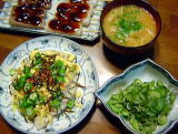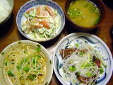 鰹のたたき、 スパゲッティーサラダ、 もやしの酢の物、おみそ汁 |