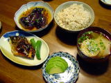 鯖の塩焼き。茄子の南蛮漬け。 湯葉のお汁。アボガド刺身風 20穀米。 |