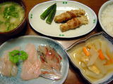 刺身(ほご、むくだい、鯵)、エノキの豚バラ巻き、 大根の煮物、みそ汁 |