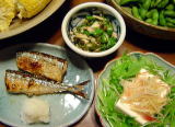 生秋刀魚塩焼き、変わり冷や奴、めかぶとおくらとシメジの和え物、枝豆、トウモロコシの塩ゆで |
