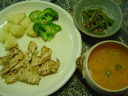 | 鶏むね肉のハーブ焼き 人参スープ、 インゲンの胡麻和え |