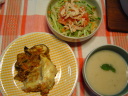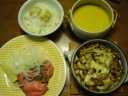 茄子と挽肉のチーズ重ね焼き、ジャガイモとゴボウのポタージュ。チキンとトマトのマリネードサラダ | 天麩羅そば | 親子丼と鯛のつみれ | 天然の鮎