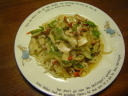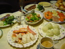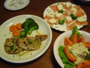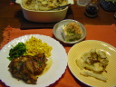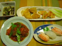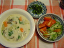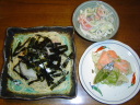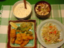 | 鯛の酒蒸し、茸ときぬさや等野菜のガーリックオリーブソテー。厚揚げのステーキ。豚汁 | シーチキンのスパゲティくずきりのサラダ、 スモークサーモンマリネ |