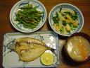 鯵の開き(豊後水道) ベーコンとインゲンのごま油炒め。 大根葉の煮浸し、みそ汁 |